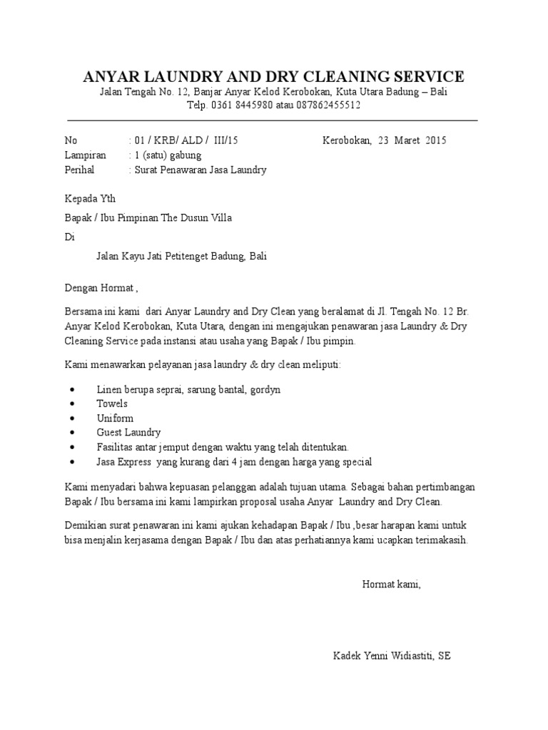 Contoh Proposal Laundry Hotel Aloha Pdf No 023 Ms Ol Vi 2015 Hal Penawaran Kerjasama Laundry Lamp 1 Satu Bendel Dengan Hormat Bersama Ini Kami Dari Course Hero from www.coursehero.com Untuk lebih jelasnya, kita simak beberapa contoh surat lamaran berikut ini, agar kalian semua memiliki gambaran dalam menulis lamaran pekerjaan ya gramedians. Untuk memudahkan kawan kledo dalam membuat surat lamaran kerja, berikut beberapa contoh surat lamaran kerja yang dapat digunakan sebagai referensi: Academia.edu is a platform for academics to share research papers. Contoh surat lamaran kerja terbaik. Contoh surat lamaran kerja karyawati laundry mulyawan tempattanggal lahir. Salah satu berkas penting yang harus dipersiapkan saat melamar kerja adalah surat lamaran pekerjaan. Dalam artikel ini, kamu akan mempelajari. Bekerja disini maksudnya adalah bekerja kepada orang lain dan mendapatkan gaji.