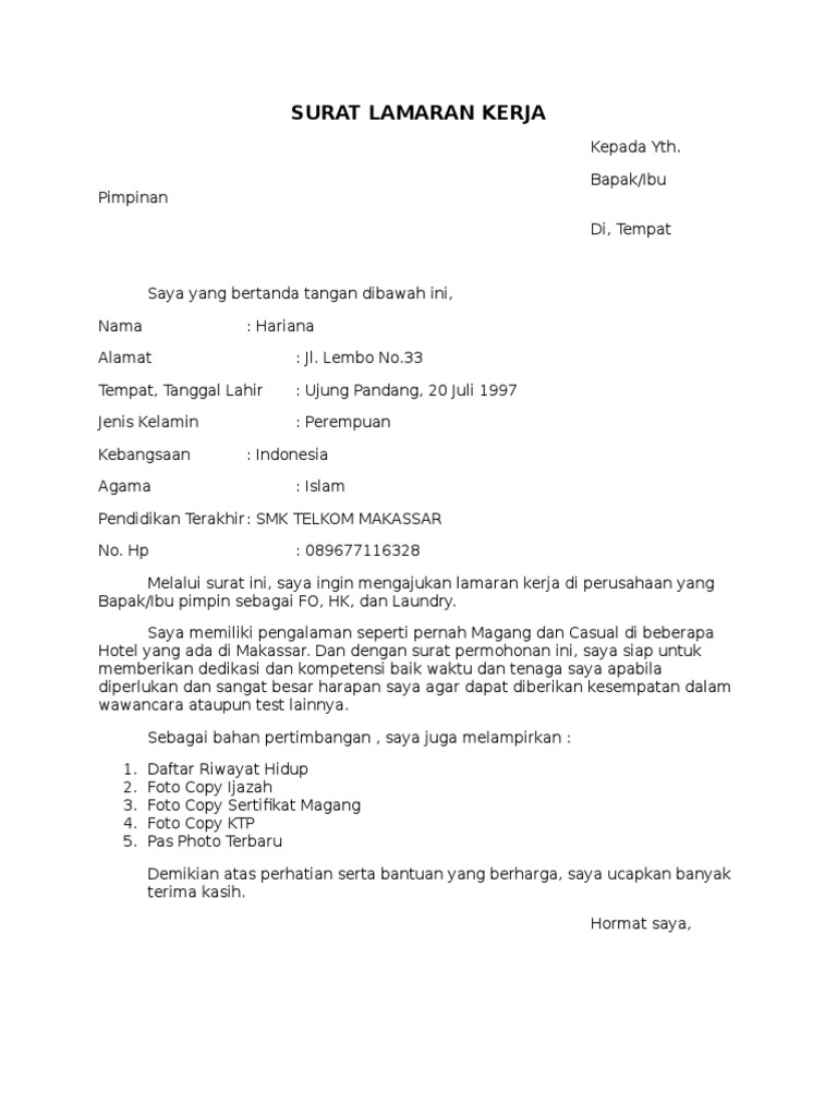 Academia.edu is a platform for academics to share research papers. Contoh surat lamaran kerja yang baik dan benar diperlukan bagi kamu yang ingin diterima di perusahaan impian. Academia.edu is a platform for academics to share research papers. Contoh surat lamaran kerja laundry. The collection that comprising chosen picture and the best among others. Pengalaman kerja dan skill 7. Surat lamaran mandiri syariah contoh surat lamaran kerja di bank mandiri syariah Kwitansi merupakan dokumen atau surat yang digunakan sebagai tanda bukti telah terjadinya transaksi pembayaran sejumlah uang dari orang. Human resources blemcoss street cempaka tengah 13 jakarta Bekerja disini maksudnya adalah bekerja kepada orang lain dan mendapatkan gaji. Contoh surat lamaran cpns bkn have an image from the other.contoh surat lamaran cpns bkn in addition, it will feature a picture of a sort that may be seen in the gallery of contoh surat lamaran cpns bkn. Dalam artikel ini, kamu akan mempelajari. Contoh surat lamaran kerja di bank adalah postingan yang akan saya bagikan kali ini untuk anda.
